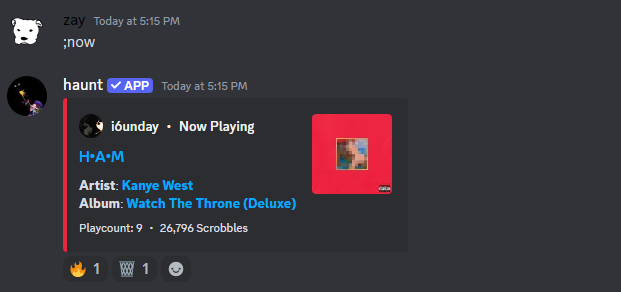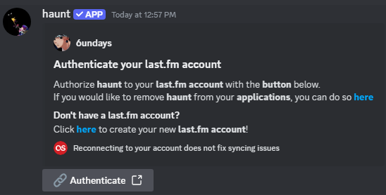 command to share what you’re listening to. This works by taking the music statistics from your Last.fm account. You can connect your Spotify account and start scrobbling from there by going here.