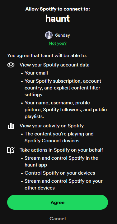 After clicking on the authenicate button, You will be asked to grant haunt access to your spotify account.