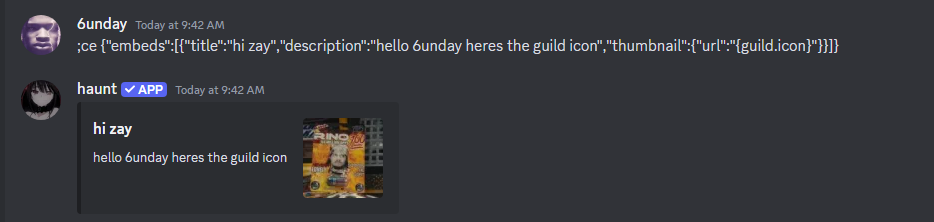To create a embed, you must know how to use parameters and variables. All embed code will begin with{"embeds":[]}. This is to specify that you want the content to be an embed instead of a normal message. Parameters will always begin with a left curly bracket to start your parameter.